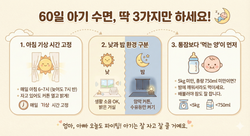 왜 이게 중요할까요? 아침 기상 시간을 일정하게 맞춰주면 일주기리듬에 더 빨리 적응하고, 3-4개월 무렵 발달하는 밤잠이 보다 일찍 정착하게 됩니다.